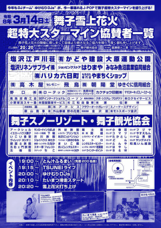 ※雪上花火終了後 舞子高原ホテルより越後湯沢駅行シャトルバスを運行いたします。なお20:15発便は運行いたしませんのでご注意ください。