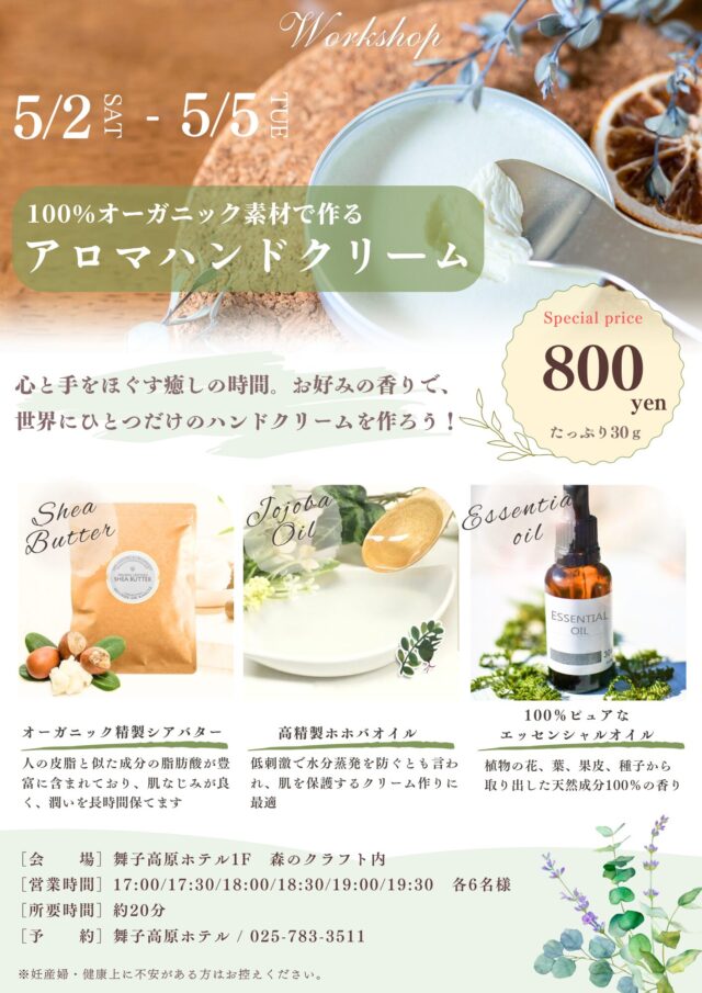 【森のクラフト】アロマハンドクリーム作り ワークショップ 2026.04.24 5月2日(土)~5日(火・祝)に、舞子高原ホテル【森のクラフト】でアロマハンドクリーム作りのワークショップを開催いたします。 前へ